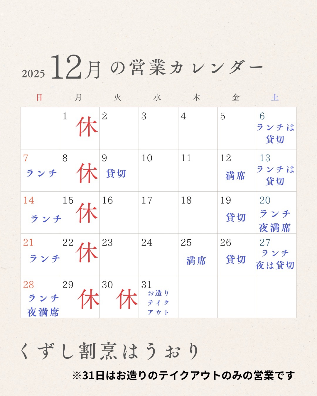 ディナー、19.20.25.26.27.28はすでに貸切や、満席になっております